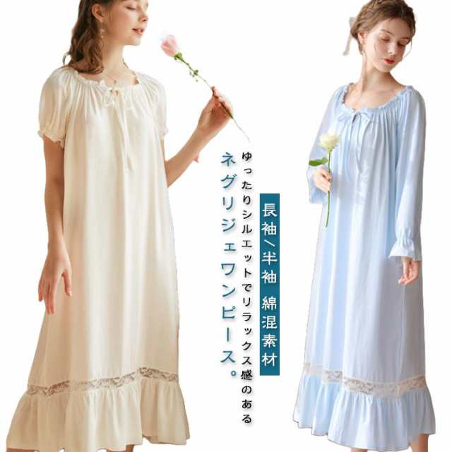 綿 寝巻き 姫系 無地 夏 ネグリジェ レディース ルームウェア ロング 姫 半袖 長袖 春 ワンピース 部屋着 パジャマ ガウン ナイトウェア ロング丈 可愛い ネグリジェワンピース 綿 秋 ルームワンピース 女性 ブルー ホワイト ピンク