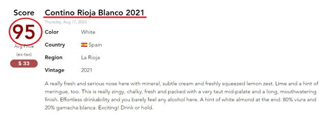 白ワイン[コンティノ・ブランコ]は毎年多くの評価を得ている逸品でもあります。この2021年ヴィンテージは、米有力ワイン評価サイト[ジェームス・サックリング]にて見事【95点】を獲得!!