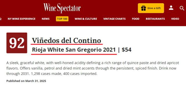 また、米有力評価誌[ワイン・スペクテーター]においても、【92点】を獲得!!