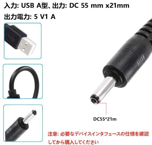 【DC電源供給ケーブル】:本製品はUSBオス端子からDC (外径5.5mm内径2.1mm) プラグへの変換ケーブルで、最大5V / 1Aの対応し。ケーブルの長さは約1mです。