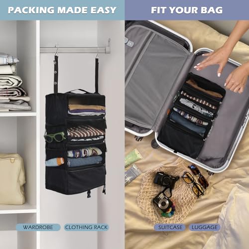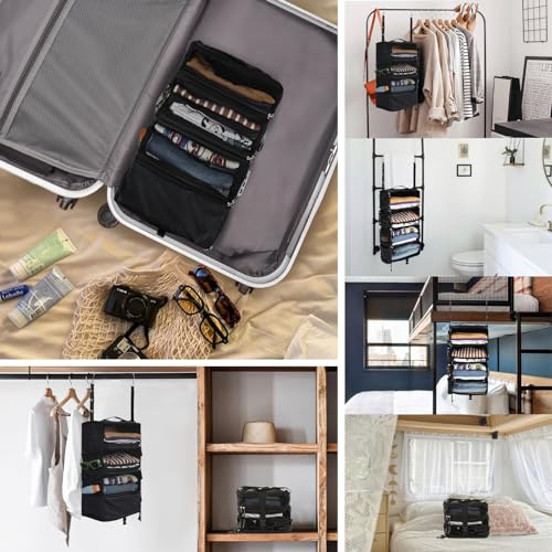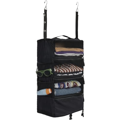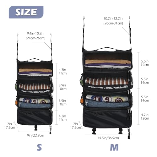 吊り下げ収納ボックス クローゼット スーツケース バックパック インナーバック トラベルポーチ 圧縮バック 衣類ラック ファスナー付き4段 折りたたみ 大容量 出張 旅行 キャンプ 省スペース(ブラック M)