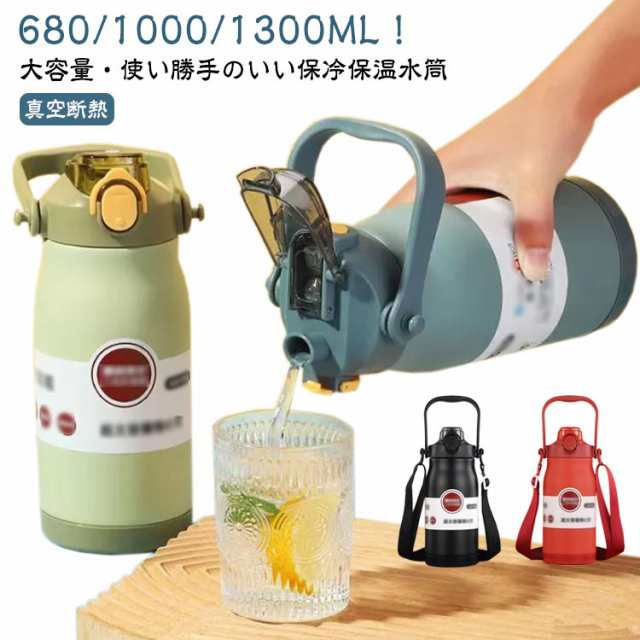 | 680/1000/1300ML!大容量・使い勝手のいい保冷保温水筒 ハンドルとショルダーストラップ付きで、手提げしたり、斜め掛けたりできるから、学校、外出やアウトドア時にとても便利。 外気の熱の影響を受けにくい真空二重構造、長時間氷をキープします。 ロックを解除し、ワンタッチオープンで簡単にふたを開けることができます。フタの裏面にシリコーンのパッキン付きなので、しっかり閉まって、中身がこぼれにくい。 そのまま飲めることもできるし、ストローを利用することもできます。スポーツや部活、アウトドアに最適なスポーツジャグです。 大きなな口径、大きめ氷もラクラク入ります。 各パーツは取り外し可能、いつも清潔に。 | |