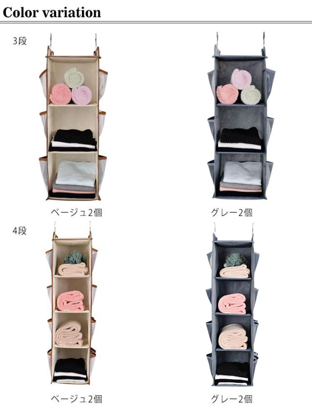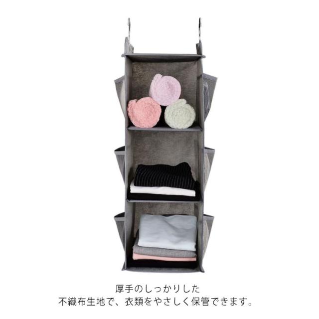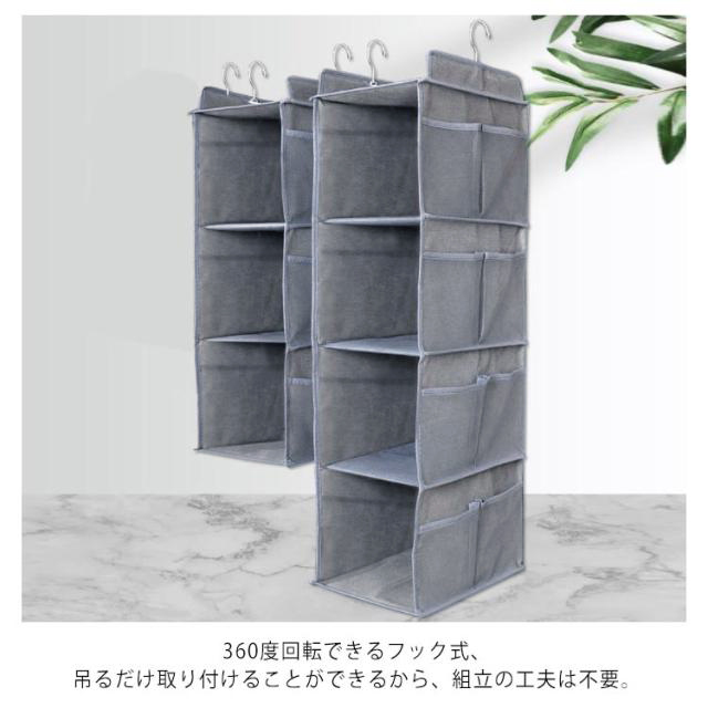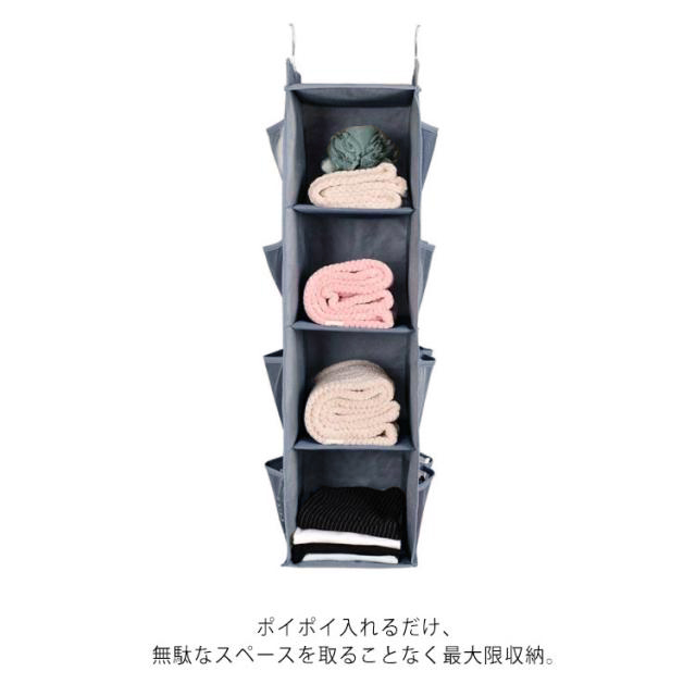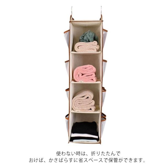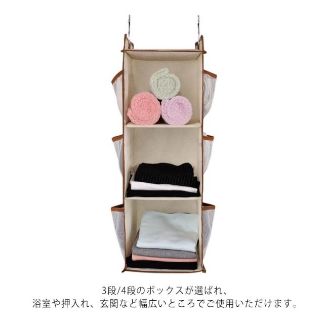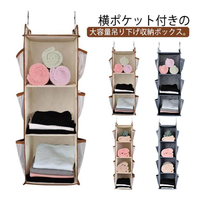 | 横ポケット付きの大容量吊り下げ収納ボックス。 衣類だけではなく、ブラ、下着、靴下、マフラーなど小物もスッキリ収納できます。 360度回転できるフック式、吊るだけ取り付けることができるから、組立の工夫は不要。 厚手のしっかりした不織布生地で、衣類をやさしく保管できます。 ポイポイ入れるだけ、無駄なスペースを取ることなく最大限収納。 3段/4段のボックスが選ばれ、浴室や押入れ、玄関など幅広いところでご使用いただけます。 使わない時は、折りたたんでおけば、かさばらすに省スペースで保管ができます。 | |