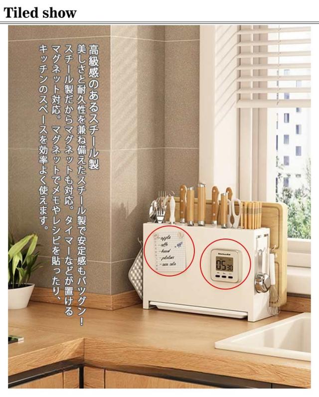| 1. スマートでスタイリッシュ こんなに収納できるのに見た目がスマート!オシャレなキッチンスペースにもピッタリです。包丁差しの四方は通気性がよく、素早く乾燥させ、水切りをして清潔に保つことができます。底部は水を受けるトレイが付き、引き出し式で取出しが便利、いつでも清潔にご使用いただけます。お箸立ての底部も小さな穴があり、通気性が良く水切り簡単になり、脱着式で汚れたら簡単に取り外して水洗いできます。 2. 高級感のあるスチール製 美しさと耐久性を兼ね備えたスチール製で安定感もバツグン!スチール製だからマグネットも対応。タイマーなどが置けるマグネット対応。マグネットでメモやレシピを貼ったり、キッチンのスペースを効率よく使えます。 3. 多様なサイズのまな板も収納可能 4.5cm程度の厚めのまな板、流行の丸いまな板やかまぼこ型、薄めのまな板なら複数置けるので置き場所に困りません。多機能一体化収納でスペースに有効利用?包丁立て、まな板立て、お箸立てや鍋蓋スタンドを一体化して、刃渡り20cmまでの包丁が8?10本、はさみや包丁研ぎ棒、お箸、スプーン、フォーク、お玉やまな板など各種類のキッチンツールをスッキリ収納されます?コンパクトで大容量、キッチンのスペースをを有効に活用。 | |