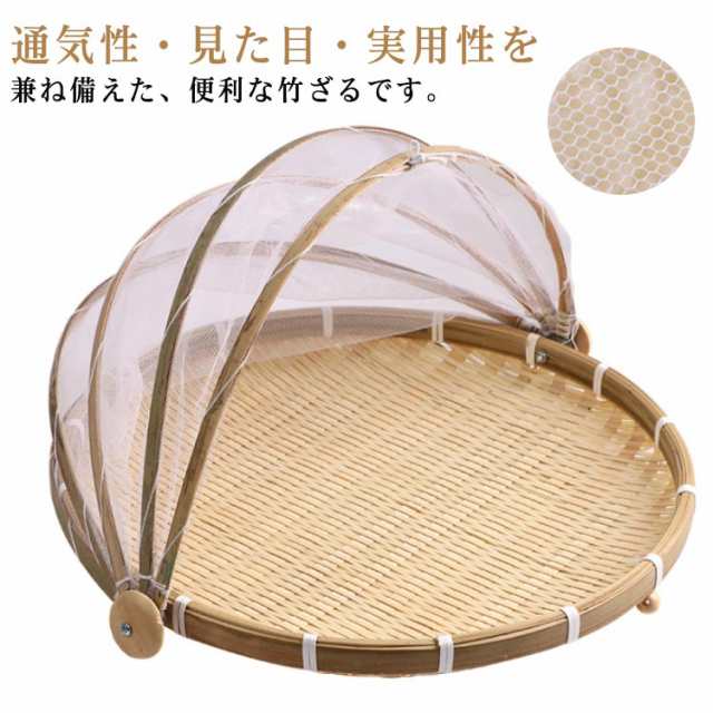 竹かご 水切りザル 梅干し 梅ざる 竹ざる 3サイズ 盆ざる 丸盆ざる 虫対策 天日干し 防塵 可動式フタ 漬物 通気性 陰干し 収納便利 使いやすい 台所用品 ネット付き 丸型 竹ざる 野菜バスケット 多機能