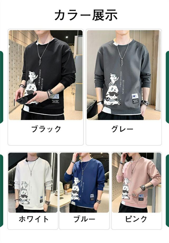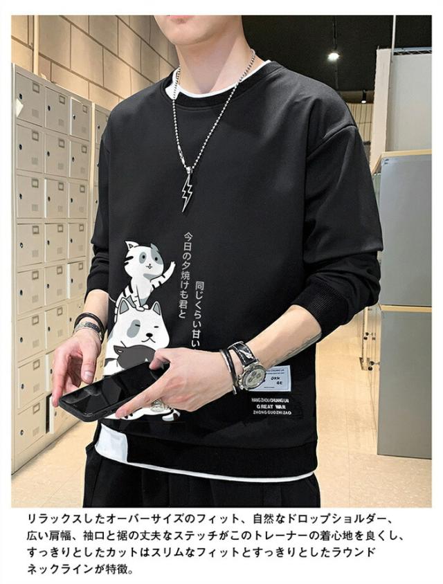 メンズ トレーナー 秋服 パーカー 長袖 tシャツ 丸首 猫 柄 プリント スウェット 大きいサイズ プルオーバー ゆったり カジュアル おしゃれ 可愛い おもしろ 無地 軽い 快適 柔らかい