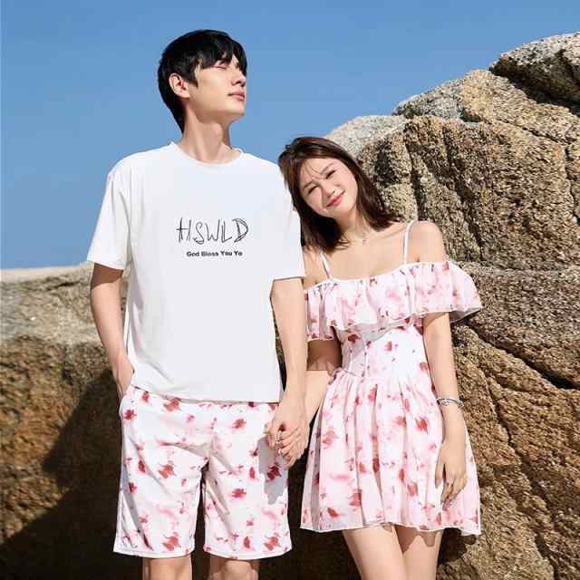 水着 ペアルック カップル 水着 ペア 韓国 人気 カップル ワンピース ショートパンツ 男性用海パンツ ワンピースタイプ ラッシュガードお揃い 水着 シンプル カジュアル 花柄