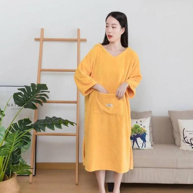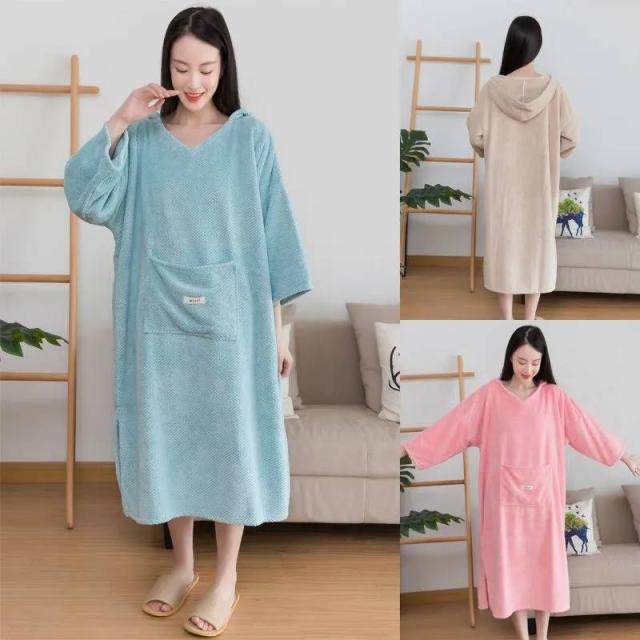 バスローブ フード付き レディース バスドレス マイクロファイバー 吸水 長袖 パジャマ ルームウエア プルオーバー ポケット スリット ミモレ丈 ワンピース 112×68cm かわいい モコモコ