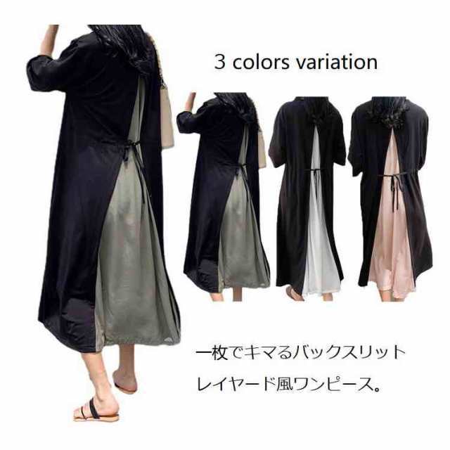 送料無料 ワンピース ロング丈 半袖 ロンTワンピース 夏ワンピ ロング丈 レイヤード風 異素材切替 フレア ワンピスター ウェストリボン付き 無地 Aライン 重ね着 レイヤード ラウンドネック バックスリット仕様 ゆったり 体型カバー お出かけ
