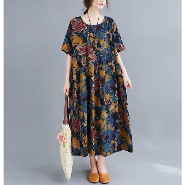 花柄 インド綿 コットンボイルワンピース Aラインワンピース ワンピース シャツワンピース マキシ丈 大きいサイズ レディース 半袖 体型