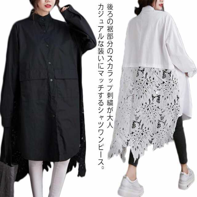 ロングシャツ レディース 無地 切り替え トップス 体型カバー レース 羽織り チュニック バックレース バックシャン ロング丈 フレアシルエット ラウンドテール 長袖 Aライン 前開き オーバーサイズ シャツワンピース