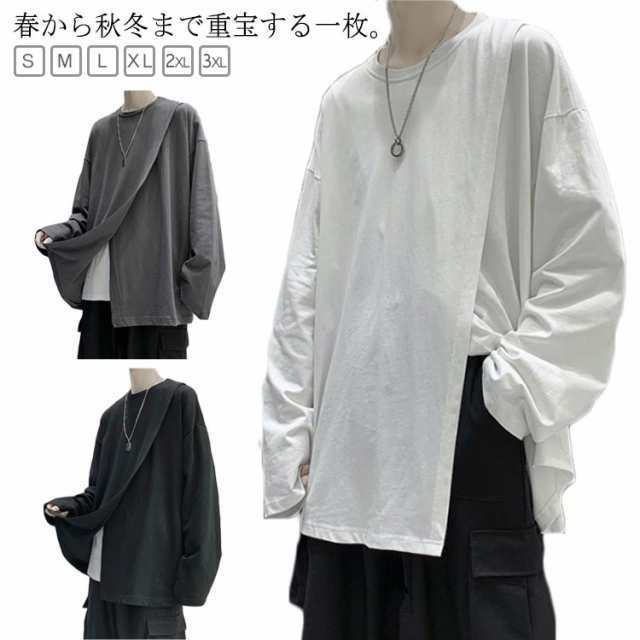 ロングtシャツ メンズ 長袖 Tシャツ ドロップショルダー カットソー 春秋服 トップス 無地 ゆったり 薄手 きいサイズ フロントスリット オシャレ カジュアル インナー レイヤード 重ね着