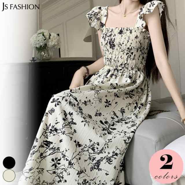 胸元 シャーリング ワンピース 花柄 全2色 肩フリル ノースリーブ ロング丈 ウエストゴム Aライン 花柄 キャミワンピ おしゃれ リゾート 春 夏