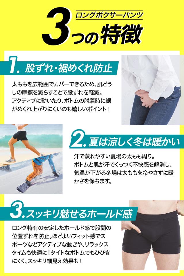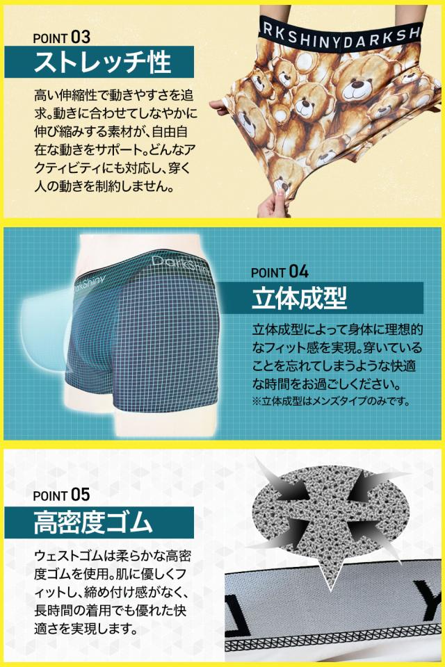 ポップなあひるを全面にプリントすることにより、 身に着けるだけで注目の的になること間違いなし。くりくりとした目がなんともチャーミング!大人気のキュートなテディベアデザイン! 愛くるしい表情がたまらない様々なサイズのテディベアがデザインされています。ロングボクサーパンツ3つの特徴1. 股ずれ・裾めくれ防止太ももを広範囲でカバーできるため、 肌どう しの摩擦を減らすことで股ずれを軽減。アクティブに動いたり、ボトムの脱着時に裾 がめくれ上がりにくいのも嬉しいポイント!2. 夏は涼しく冬は暖かい汗で蒸れやすい夏場の太もも周り。ボトムと肌が汗でくっつく不快感を解消し、 気温が下がる冬場は太ももを冷やさずに暖 かさを保ちます。3.スッキリ魅せるホールド感ロング特有の安定したホールド感で股間の 位置ずれを防止。ほどよいフィット感でス ポーツなどアクティブな動きや、リラックス タイムも快適に! タイトなボトムでもひびき にくく、スッキリ細見え効果も!