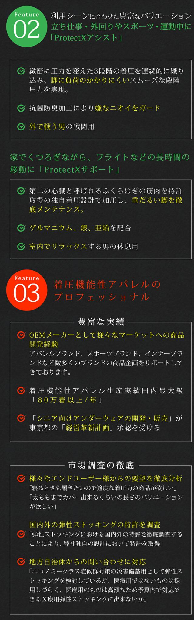 男のために開発されたメンズ着圧ソックス。戦う男の脚を守る「ProtectX(プロテクトエックス)」冬にも安心の裏起毛タイプ。足首から上部へいくほど着圧値が低くなる独自の「段階圧力設計」にて特許取得。疲れて重だるくなった脚を徹底メンテナンス。足のむくみが辛い方は一般医療機器(ProtectXメディカル)もオススメ。