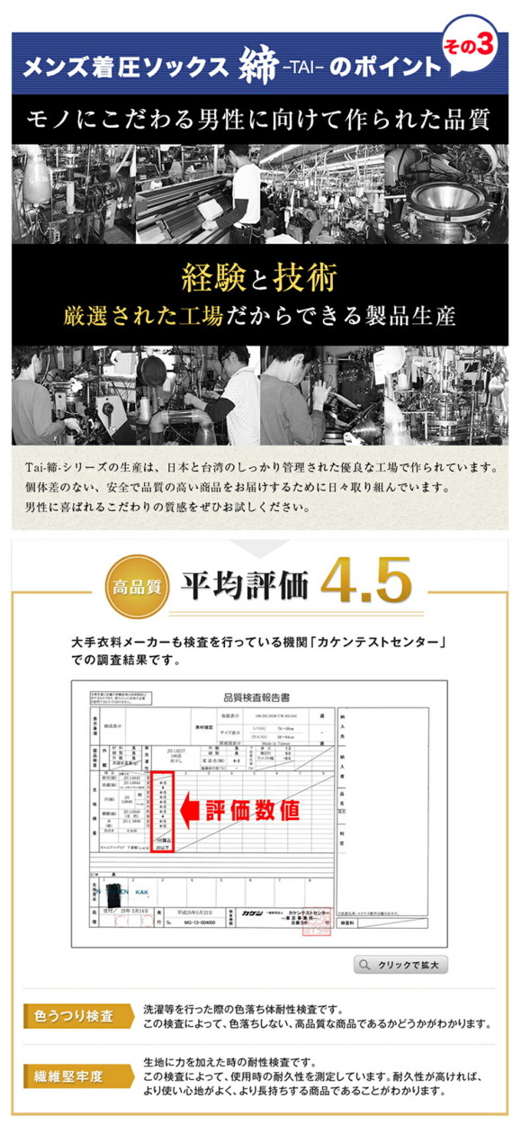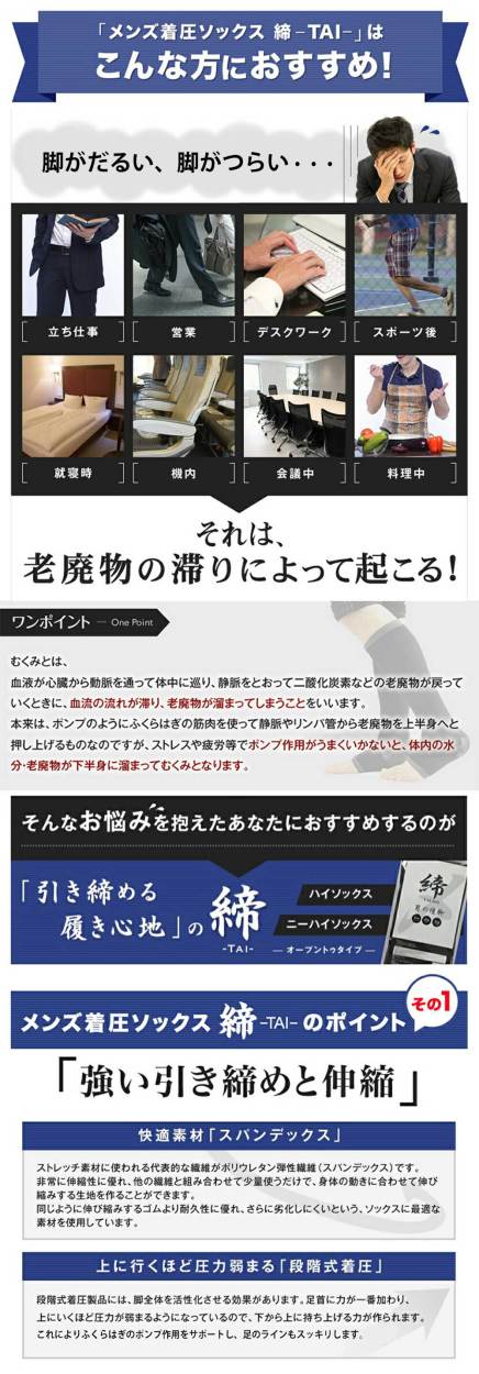 順天堂大学客員教授推奨!男性専用の着圧ソックス筋肉は血管やリンパ管を収縮させ循環させるポンプの役割もします。ふくらはぎの筋力が低下したり、筋肉の収縮運動が少ないと、リンパ管の収縮運動が少なくなり、老廃物が溜まりやすくなります。本商品は足首から段階的な着圧をかけることで筋肉ポンプの補助効果を目指します。さらにゲルマ、亜鉛、ナノ銀を配合しており、着圧力、滋養成分、防臭対策も兼ねております。<こんな方におススメです>・立ち仕事で足を酷使している方・デスクワークが多い方・勤務中のマッサージ靴下が欲しい方・睡眠中に着用できるリラックス靴下を探されている方【ご注文前にご確認ください】本商品はネコポスでお送りする為、代引き決済及び配送日指定は出来ません。代引き決済を選択されますと宅配便送料が加算されます。材質: ナイロン88%、ポリウレタン(スパンデックス)12%※1足(両足分)入りご使用方法1.ソックスをたぐりよせて、つま先を入れます。2.足首まで引き上げ、かかとの位置を合わせます。3.少しずつ引き上げ、ひざ下まで捲り上げ着用します。