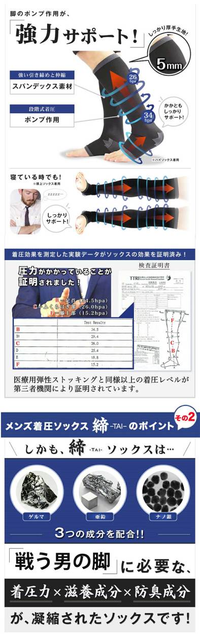 筋肉は血管やリンパ管を収縮させ循環させるポンプの役割もします。ふくらはぎの筋力が低下したり、筋肉の収縮運動が少ない(座っている状態)と、リンパ管の収縮運動が少なくなり、老廃物が溜まりやすくなります。本商品は足首から段階的な着圧をかけることで筋肉ポンプの補助効果を目指します。立ち仕事で足が疲れる、デスクワークが多い、そんな男の方におすすめのお手軽ケア商品です!さらに本商品はゲルマ、亜鉛、ナノ銀を配合しており、着圧力、滋養成分、防臭対策も兼ねておりますので勤務中に着用してマッサージ靴下として、または睡眠中に着用して快適な朝を迎えるためのリラックス靴下としても使用できます。