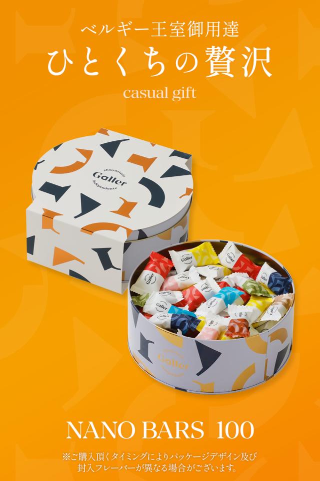 ベルギー王室御用達高級チョコレートブランド「Galler(ガレー)」。香り高く口どけのよい、素材とレシピにこだわったチョコレートです。ガレーで人気のミニバーがさらに一口サイズのナノバーとなって登場。個包装された一口サイズのナノバーをブランドカラーの缶にアソートしたお得なセットになっています。