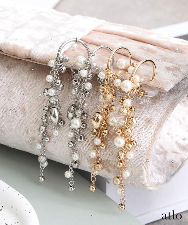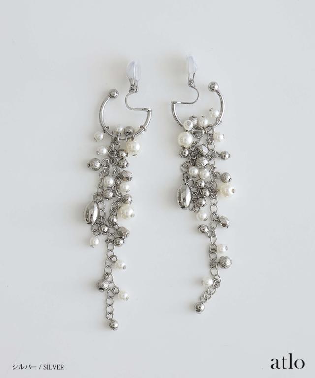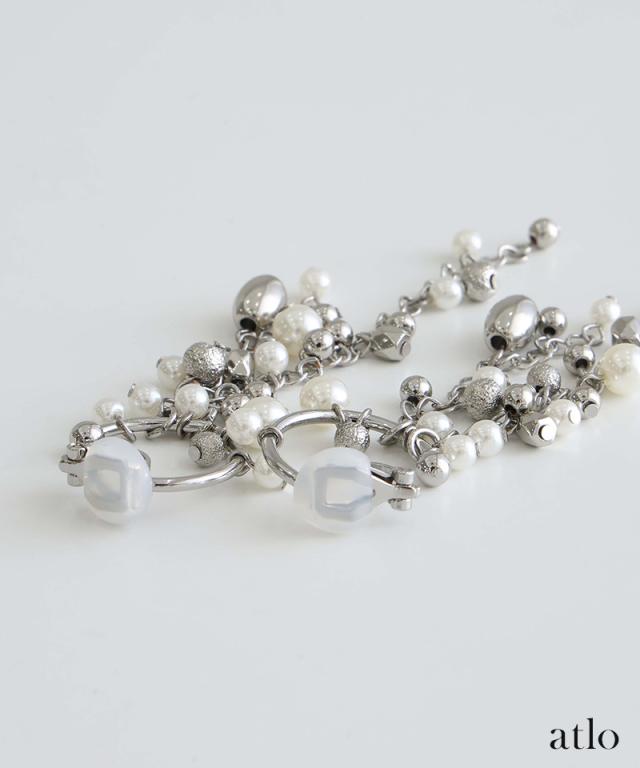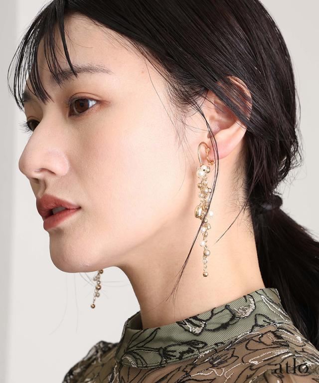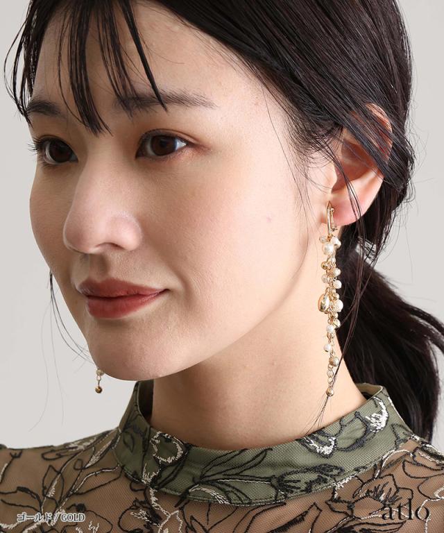 形の異なるパールやメタルパーツがランダムに連なった、ロングイヤリングです。