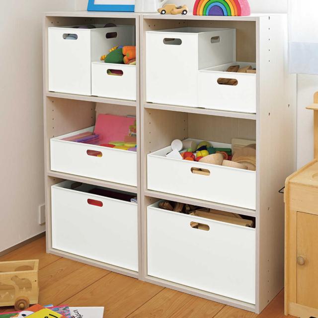 サイズ違いとスタッキング可能です。四角い形なので、並べてもすき間ができず、スペースを有効活用できます。下に雑誌や本、上におもちゃなど、種類ごとに分けてすっきり収納できます。底の突起が下段のボックスにはまるため、ズレにくいです。