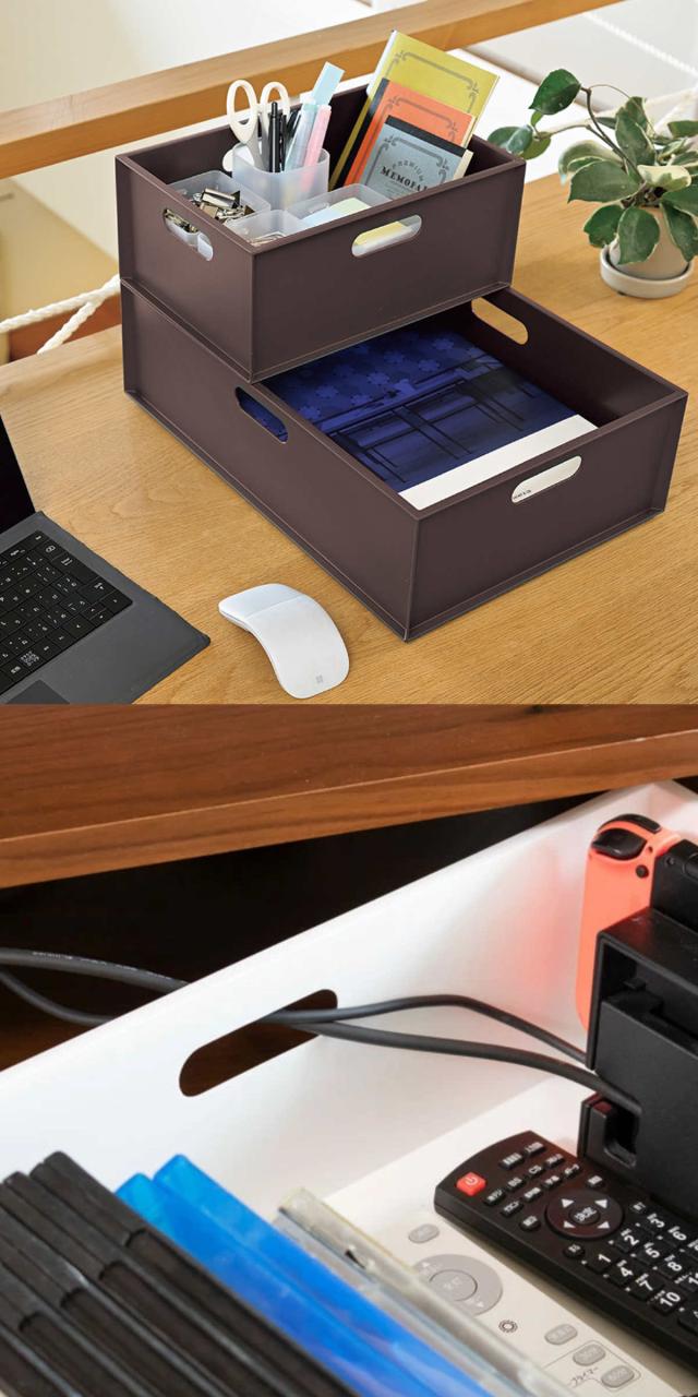 文房具、メイク道具など散らかりがちな小物類をすっきり整理できます。穴からコードを通せるため、電源タップやテレビ周辺の整理にもおすすめです。