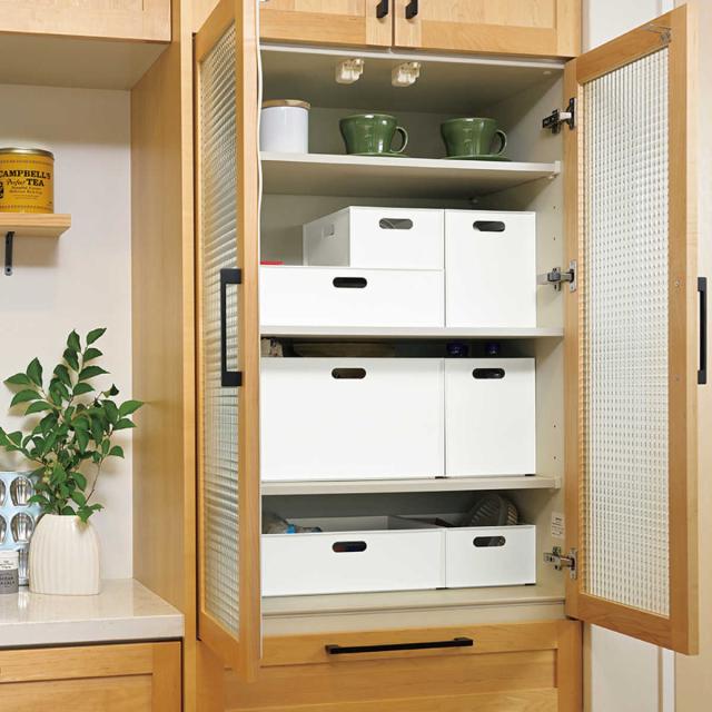 カラーボックスをすっきりと整理できる収納ボックスです。収納物が透けないので生活感を出さず、リビングなど人目がつきやすい場所にも最適です。パントリーやクローゼットなどの作り付け棚やラックにもちょうどいい大きさです。