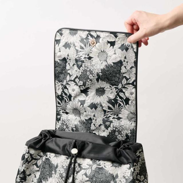 向日葵、ゼニアオイ、アンゼリカ、ヒナギク、シャクヤク、紫陽花などの花が力強く描かれたデザインです。バッグの裏にも柄が入っていて細部までこだわっています。