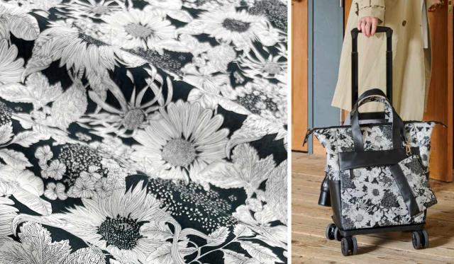 向日葵、ゼニアオイ、アンゼリカ、ヒナギク、シャクヤク、紫陽花などの花が力強く描かれたデザインです。バッグの裏にも柄が入っていて細部までこだわっています。