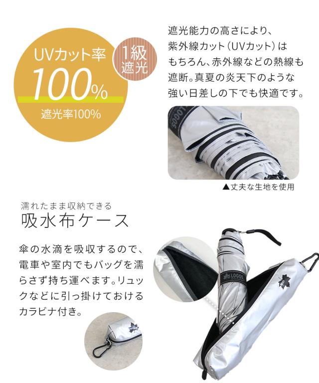 LOGOS 折りたたみ傘 晴雨兼用 コンパクト 1級遮光 手開き 60cm 吸水布ケース 遮光率100% UVカット UPF50+ 遮熱効果 紫外線対策 メンズ レディース アウトドア ロゴ キャンプ 社内 車 置き傘 予備 レイングッズ 雨具 アンブレラ 傘 雨傘 日傘 シルバー ロゴス 688555