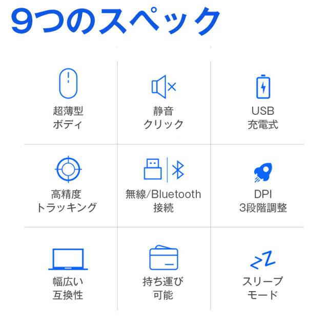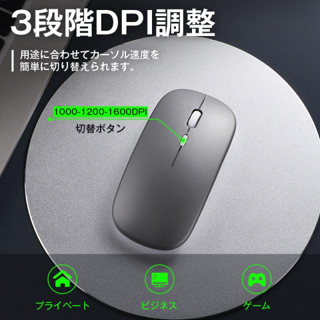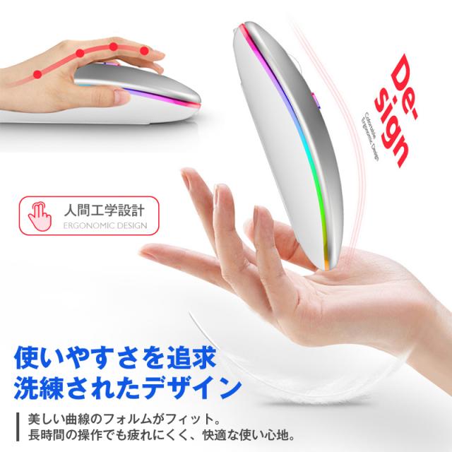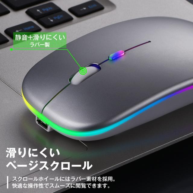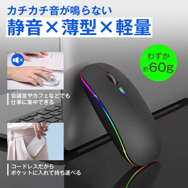 マウス ワイヤレス 静音 薄型 コードレス Bluetooth5.1 無線 2.4GHz 軽量 USB 充電式 小型 高感度 光学式 DPI調整 LED発光 PC Windows Mac タブレット iPad 対応