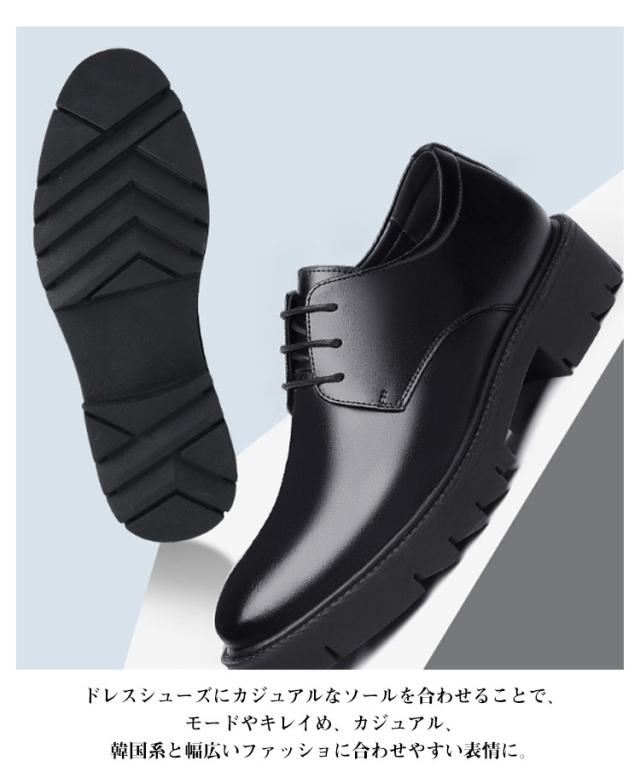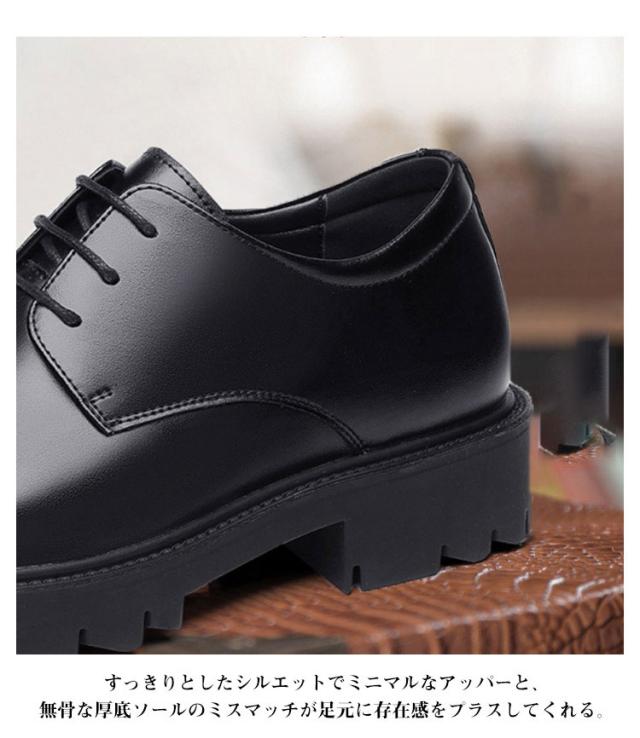 | 8cm/5cm身長アップ!背が高くなるシークレットシューズ。 スーツをカッコよく着こなす脚長スタイルを実現してくれます! ドレスシューズにカジュアルなソールを合わせることで、モードやキレイめ、カジュアル、韓国系と幅広いファッショに合わせやすい表情に。 すっきりとしたシルエットでミニマルなアッパーと、無骨な厚底ソールのミスマッチが足元に存在感をプラスしてくれる。 衝撃吸収のインソールと、軽量で履き心地がよく歩きやすいので、タウンユースは勿論、カジュアルシーン、旅行などにも最適! コーディネート問わず様々なスタイルに取り入れやすいので、幅広いシーンで活躍してくれる大人のスタイリングに欠かせないクラシックな風格の大人ドレスシューズです。 | |