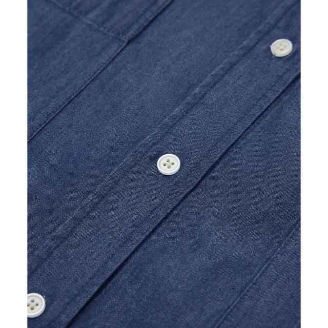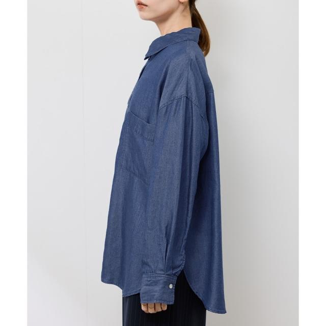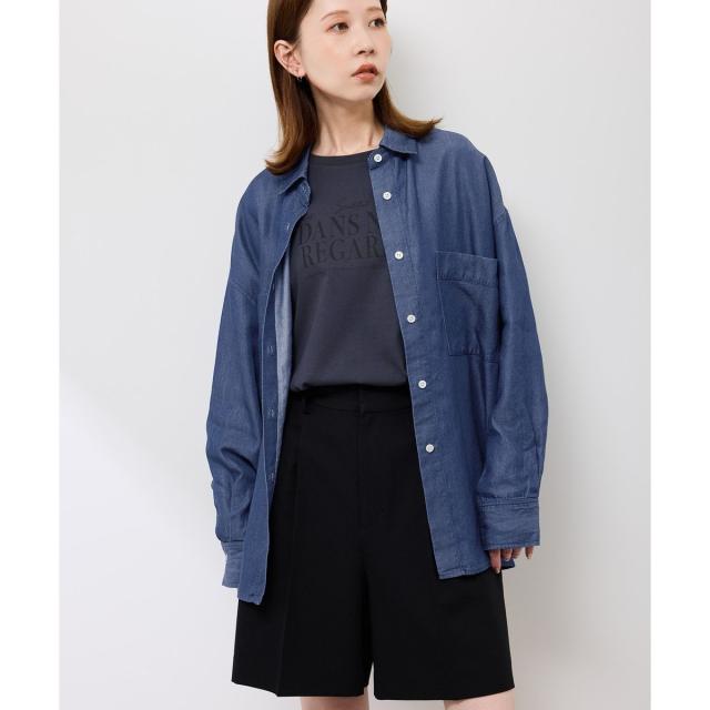 ・羽織やすい着丈のシャンブレー素材のシャツ。