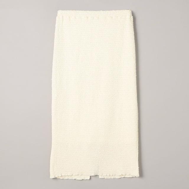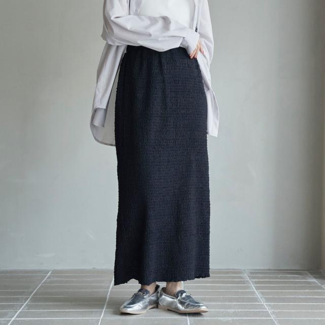 凹凸のあるシャーリング生地に表情豊かなポコポコ素材が映える、すっきりとした印象のナロースカート。