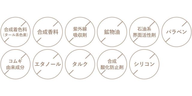 合成着色料(タール系色素)、合成香料、紫外線吸収剤、 鉱物油、石油系界面活性剤、パラベン、コムギ由来成分、エタノール、タルク、合成酸化防止剤、シリコン 不使用です。 | ぴたっと密着するのに石けんで簡単にオフ