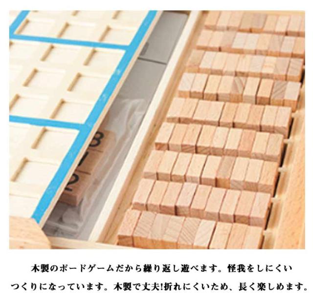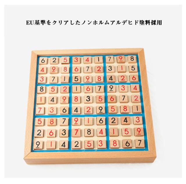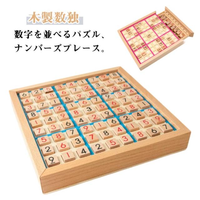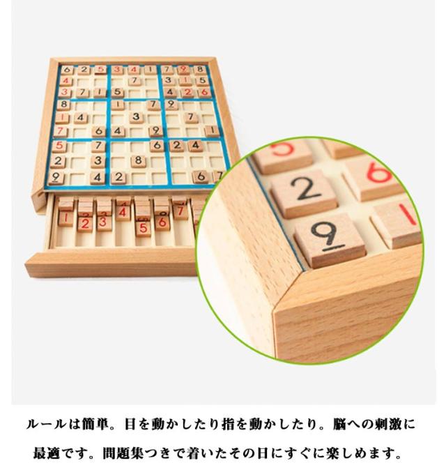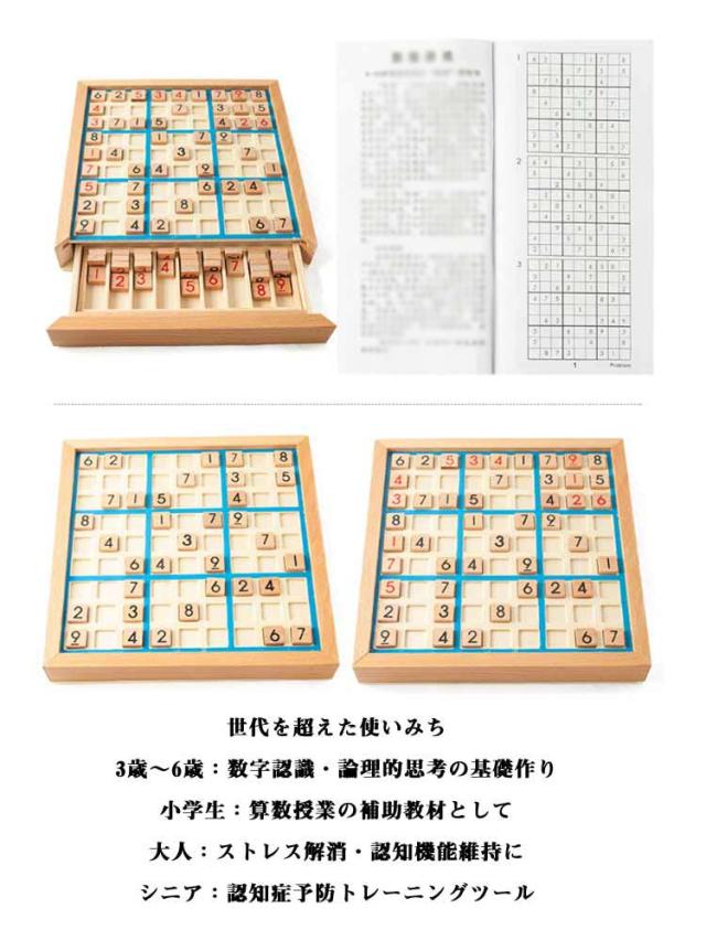 | 【木製数独】 数字を並べるパズル、ナンバーズプレース。 脳トレ、知育玩具として人気の高いナンプレは子供から大人まで家族揃って楽しめます。 ルールは簡単。目を動かしたり指を動かしたり。脳への刺激に最適です。 問題集つきで着いたその日にすぐに楽しめます。 自然素材のぬくもりと安全設計・深山林から採れた天然木を使用し、角の丸い加工でケガ防止 EU基準をクリアしたノンホルムアルデヒド塗料採用 引き出し付き収納BOX付属でパーツ紛失を防止 木製のポードゲームだから繰り返し遊べます。怪我をしにくいつくりになっています。木製で丈夫!折れにくいため、長く楽しめます。 世代を超えた使いみち 3歳〜6歳:数字認識・論理的思考の基礎作り 小学生:算数授業の補助教材として 大人:ストレス解消・認知機能維持に シニア:認知症予防トレーニングツール | |