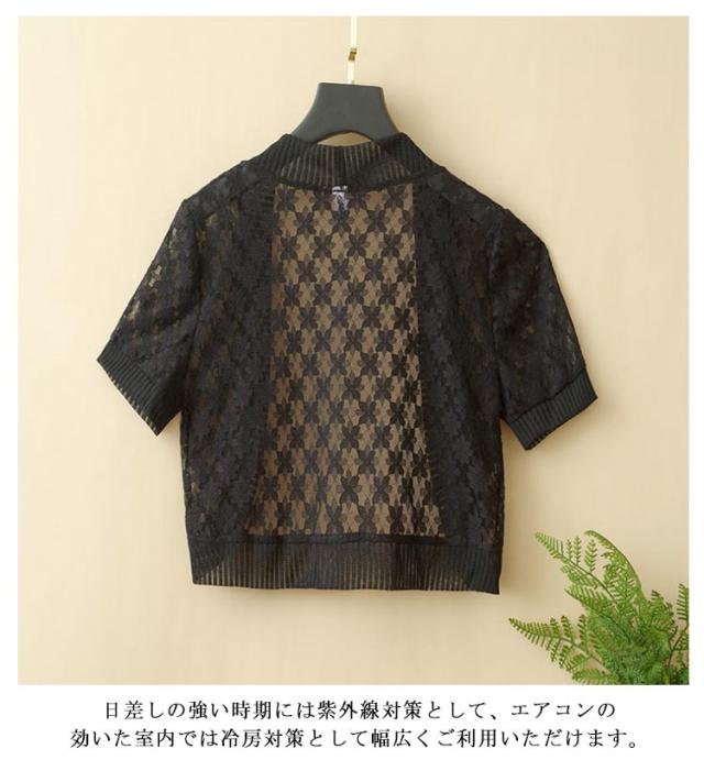 | 透かしレースで初夏から夏に向けて大活躍します。 オフィスでの冷房対策や通勤時、避暑地への旅行や機内の寒さ対策など活躍できるサマ。 身頃もゆったりとしていて、着心地はノンストレス。 カジュアルな表情と上品さを併せ持った1枚です。 軽量でかさ張らず、持ち運びも可能です。 無地でシンプルなデザインなので幅広い年代でご利用頂けるショートトップスです。 日差しの強い時期には紫外線対策として、エアコンの効いた室内では冷房対策として幅広くご利用いただけます。 | |
