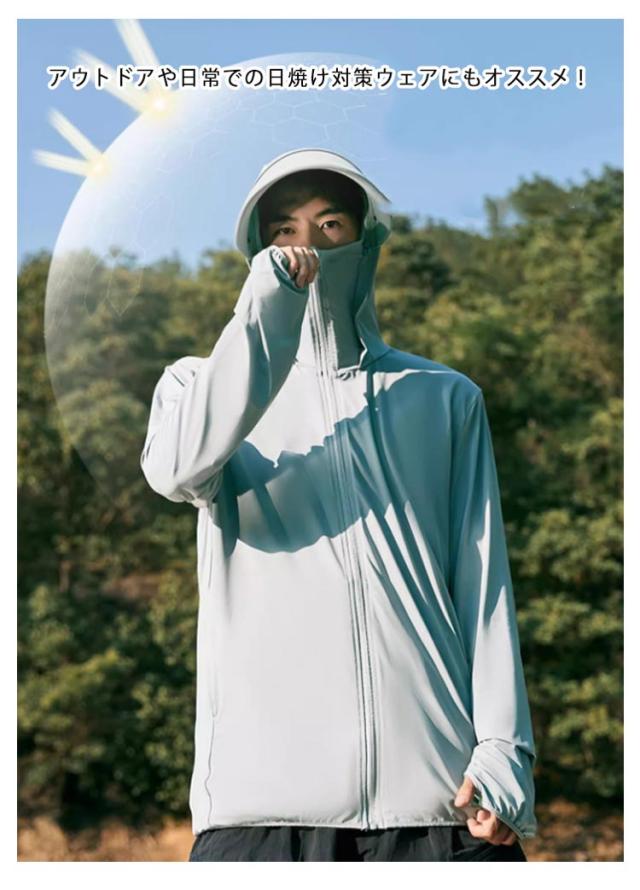 | 長時間外にいなくてはいけない時も紫外線から肌を守ります! サイクリングなどの屋外アクティビティなど、様々なシーンで使える1着があれば、安心の万能パーカー。 柔らかく、滑らかで涼しげな素材を使用。一般の蒸し暑い生地ではなく、独特な紡織技術で織った通気性と速乾性に優れな生地を使用、汗ばむでも蒸れません。伸縮性がある生地のため、ストレスなく着用できます。 指穴付きになったデザインで、手の甲までしっかり覆えるのがポイントです。 アウトドアや日常での日焼け対策ウェアにもオススメ! | |