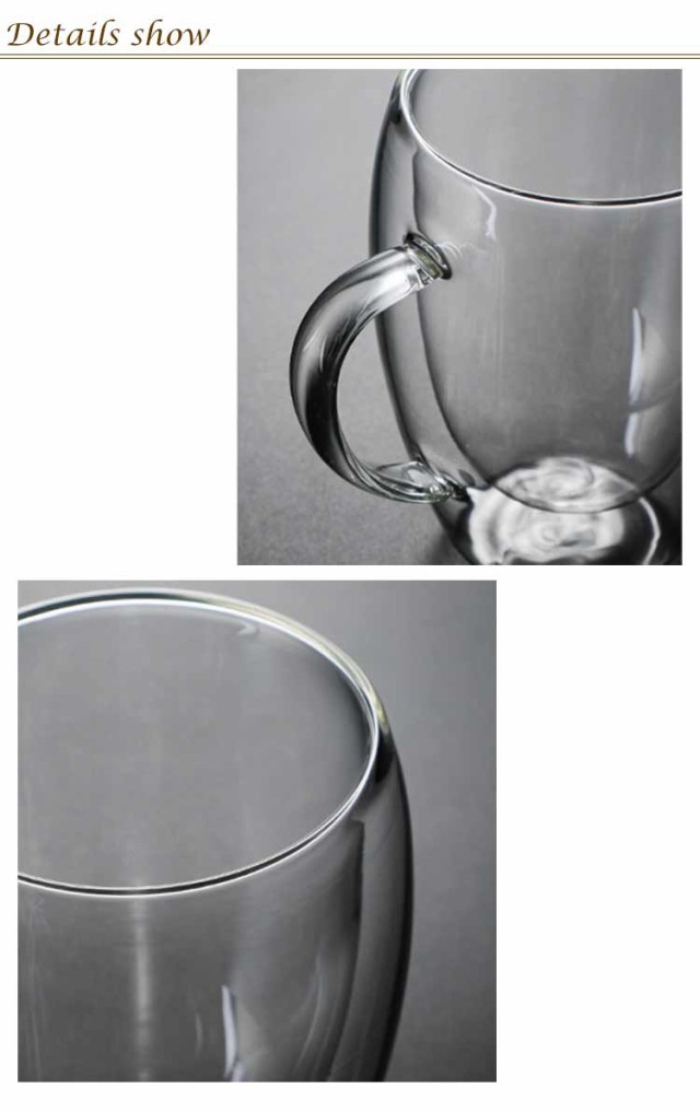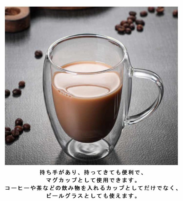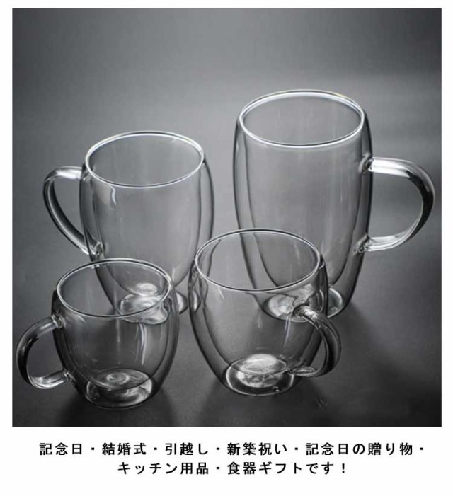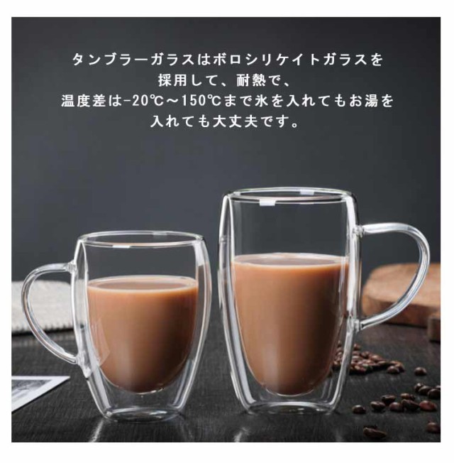 | 二重構造の耐熱ガラスカップ、保温効果だけでは無く、淹れたての熱いお飲み物がすぐに手に入れる便利な機能。 保冷効果と結露防止の効果あり、氷が溶けにくい、テーブルやコップの外はいつもきれい。飲みもののおいしさを持続させる、保温性、保冷性に優れたグラスです。 お茶、コーヒー、紅茶、ラテ、エスプレッソ、ブリュー、カクテル、ウイスキー、ビール、温冷飲料に最適なグラスです。 持ち手があり、持ってきても便利で、マグカップとして使用できます。コーヒーや茶などの飲み物を入れるカップとしてだけでなく、ビールグラスとしても使えます。 タンブラーガラスはボロシリケイトガラスを採用して、耐熱で、温度差は-20℃?150℃まで氷を入れてもお湯を入れても大丈夫です。 ゼリーカップ、お菓子カップにも使用することができます。カフェ、レストラン、オフィス、自宅で使ってもいいし、プレゼントとしてもいいです。 記念日・結婚式・引越し・新築祝い・記念日の贈り物・キッチン用品・食器ギフトです! | |