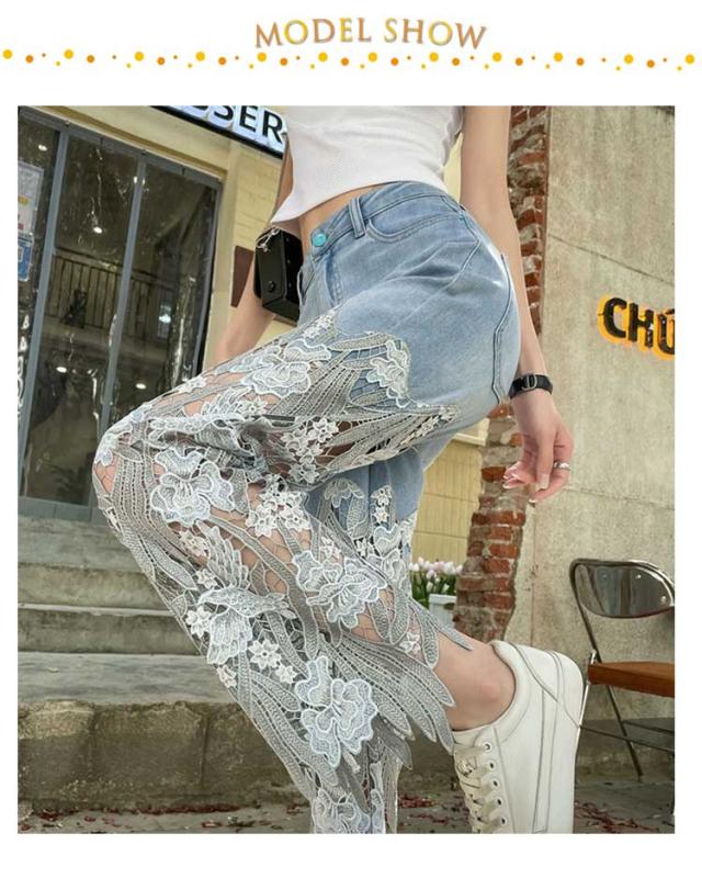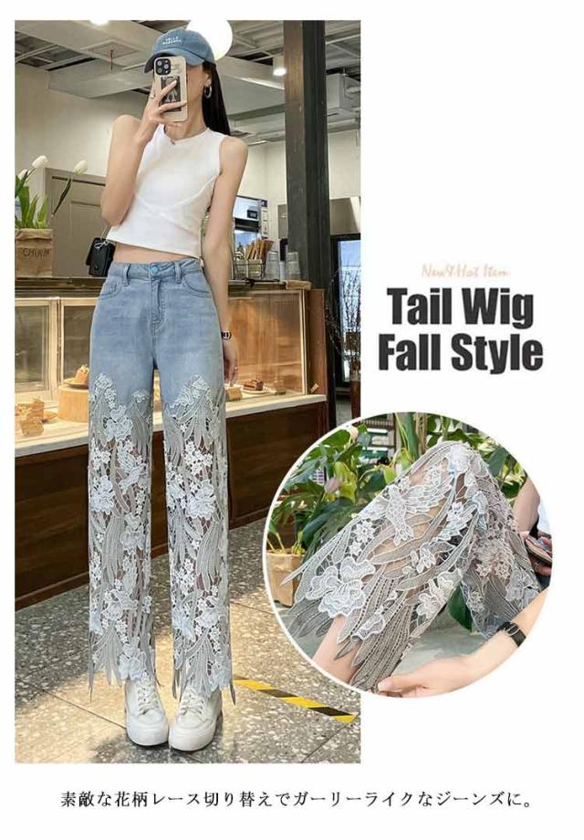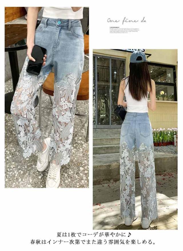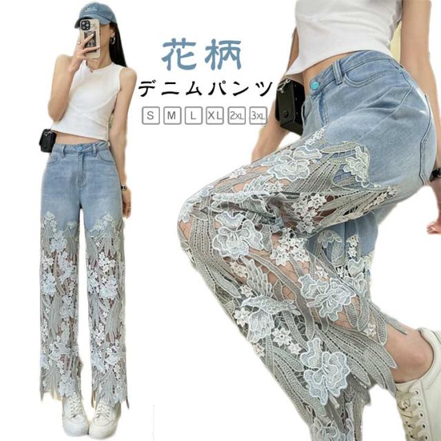 透かし ロングパンツ レース切り替え 春夏 デニムパンツ きれいめ レディース デニムパンツ ワイドパンツ 花柄 美脚 春 ジーンズ デニム ガウチョパンツ レース 夏 ゆったり 薄手 大きいサイズ おしゃれ かわいい ゆったり