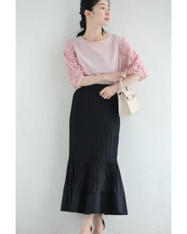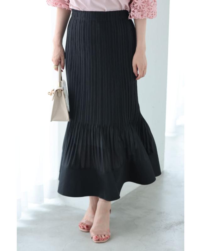 再入荷9月4日 (黒)伸びやかプリーツのフレア裾カットソーとフレア裾スカートの2点セット(ブローチ2個付き)cawaii w50553nc S~3L対応 オシャレ 個性的 大人可愛い エレガント 上品 春 夏 レディース ファッション 30代 40代 50代 福袋
