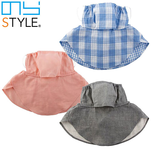 首の後ろまでぐるっとカバーする、ネックカバー付きのマスク。ネックカバーをかぶり、平ゴムの耳ひもをかけて装着します。日よけはもちろん、ホコリよけにもどうぞ。軽い着け心地の二重ガーゼです。