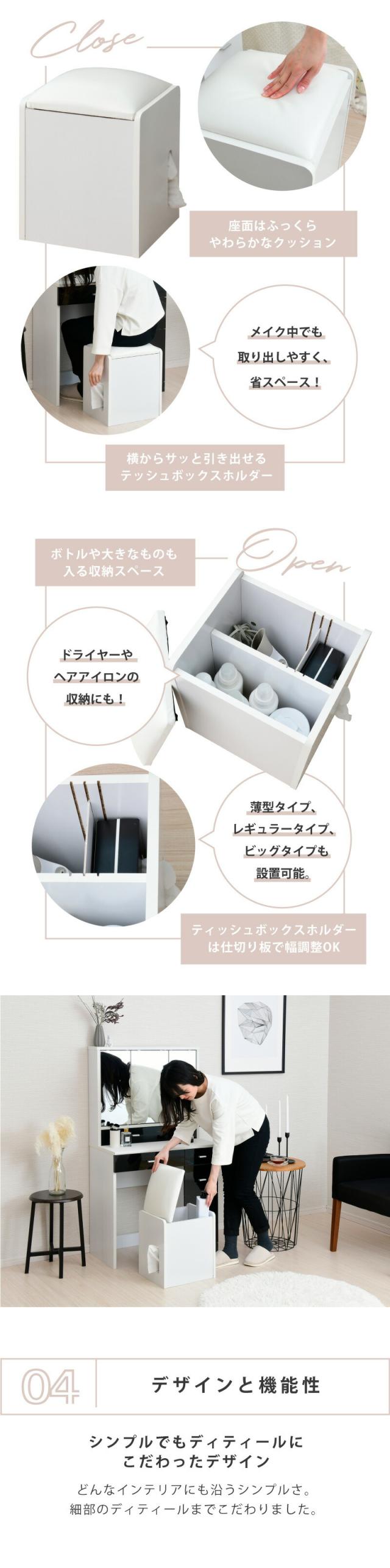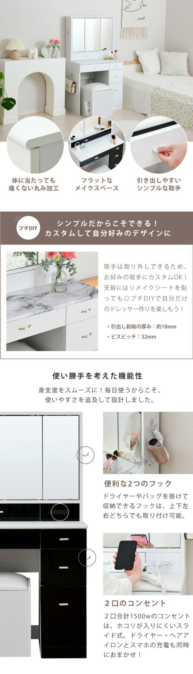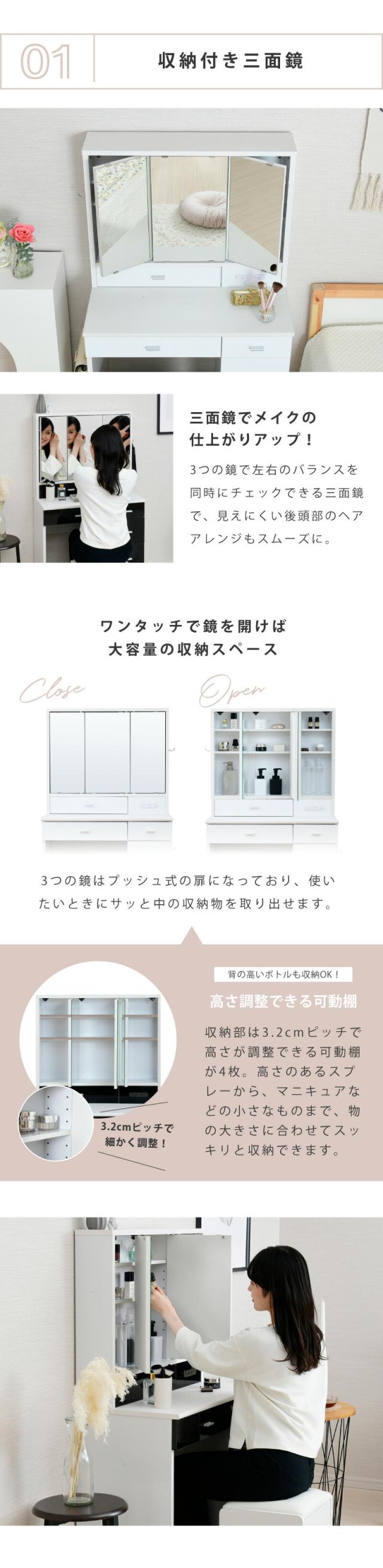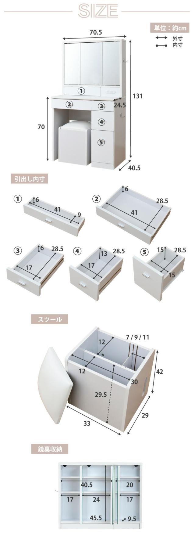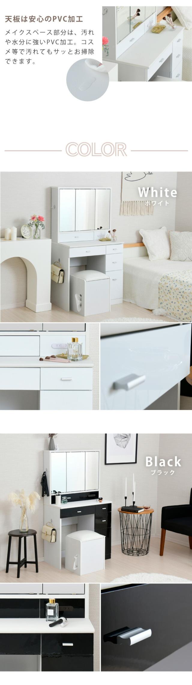 三面鏡 ドレッサー コンパクト デスク スツール付き コンセント付き テーブル 収納 可愛い おしゃれ メイク台 化粧台 メイクボックス コスメ収納 メイク 収納ボックス 机 椅子 北欧 姫 幅70cm ホワイト 白 鏡面