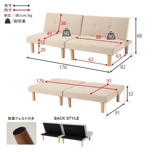 ■サイズ:(約)幅176×奥行82〜91×高さ68〜32×座面高32cm■素材: 構造部材:天然木、脚部:塩化ビニール樹脂、張地:<ブラック・ホワイト>合成皮革<ベージュ・ダークネイビー・ライトグレー>ポリエステル