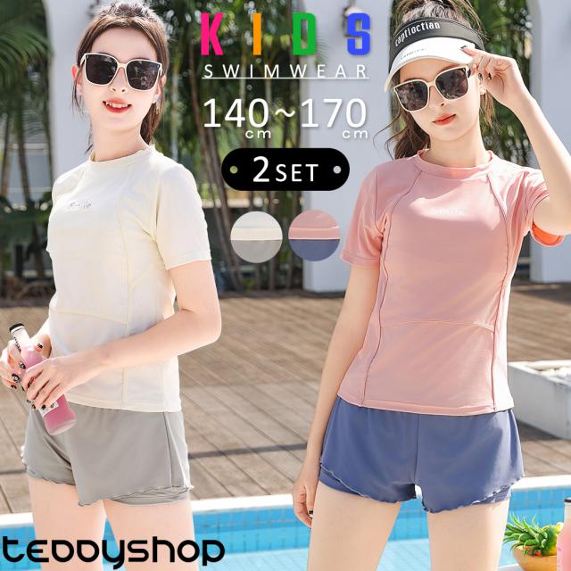 夏新作 キッズ 水着 女の子 セパレート 2点セット 140 150 160 165 170 ラッシュガード トップス 半袖 パッド付き 入れ替え可能 レイヤード パンツ一体型 ロゴ ラグランスリーブ 裾フリル 裏地付き 紫外線対策 小学生 高学年 中学生 高校生