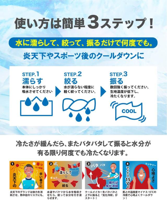 濡らして絞り振るだけ。生地が-15℃の冷感を発揮!