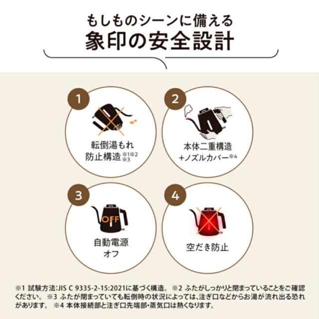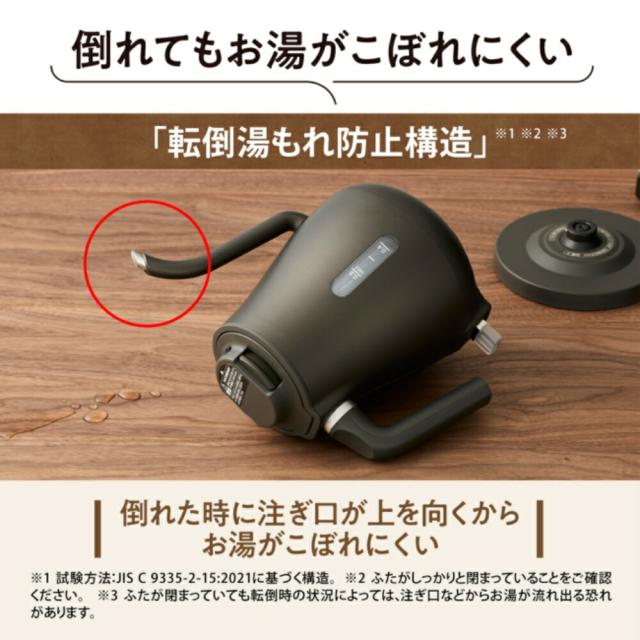-商品説明- 電気ケトル CK-LA08 BZ(セピアブラック) ☆ こだわりの先端形状とドリッパーに当たりにくいノズル形状で コーヒーの抽出に大切な湯量と場所のコントロールがしやすい細口タイプ ☆ 熱くなりにくいから手を添えて注げる「本体二重構造」+「ノズルカバー」※ ※本体接続部と注ぎ口先端部・蒸気口は熱くなります。 ☆もしものシーンに備える「象印の安全設計」 注ぎごこち”への こだわり コーヒーの抽出に大切な湯量と場所のコントロールがしやすい POINT 01 こだわりの先端形状 お湯が真下に出るように計算された先端形状で狙った場所にお湯を落としやすい。 POINT 02 ドリッパーに当たりにくいノズル形状 ドリッパーの中心に注ぎ口をもってきても、当たりにくく、狙った場所に注ぎやすい。 湯量を自由自在にコントロール 湯量を細かくコントロールでき、出すぎず、少なすぎない、 やわらかな水線を生み出します。 日常使いにもぴったり 小さなカップはもちろん、即席スープやカップ麺にお湯を注ぐなど、日常のあらゆるシーンでも活躍します。 握りやすくて、注ぎやすいハンドル形状 注ぎごこちにこだわったハンドル形状で、握りやすく、手にフィット。お湯を注ぐ角度が調整しやすく、安定して注げます。 象印の“安全設計” 注ぎ口からこぼれにくい 倒れてもこぼれにくい象印独自の「転倒湯もれ防止構造」※1※2※3 転倒時、注ぎ口が上を向く「転倒湯もれ防止構造」に加え、象印独自の構造で、ふたからの湯もれを防止します。 ※1 試験方法:JIS C 9335-2-15:2021に基づく構造。 ※2 ふたがしっかりと閉まっていることをご確認ください。 ※3 ふたが閉まっていても転倒時の状況によっては、注ぎ口などからお湯が流れ出る恐れがあります。 熱くなりにくいから両手で注げる「本体二重構造」+「ノズルカバー」※4 本体は二重構造になっており、湯沸かし直後でも外側が熱くなりにくいので、両手で注げます。また、お湯が通るノズルもカバーで覆うことで熱くなりにくくなっています。 ※4 本体接続部と注ぎ口先端部・蒸気口は熱くなります。 沸とうを検知して自動電源オフ 空だきを検知して自動電源オフ空だき防止 使いやすくて、お手入れしやすい ・湯沸かし中がひと目でわかるパイロットランプ ・ 左右どちらからでもお湯の量を確認できる見やすい水量窓(2カ所) ・ スムーズに取り外せる軽くはずせるふた ・ 給水もお手入れもらくらく広口内容器 -仕様- ・メーカー型番:CK-LA08(BZ) ・JANコード:4974305227867 ・カラー:セピアブラック ・容量:0.8L ・消費電力(湯沸かし時):1100W ・本体サイズ(幅×奥行×高さ):28cm × 16cm × 21cm ・電源プレート含むサイズ:28cm × 16cm × 23cm ・質量:約1.0kg(本体のみ)、約1.2kg(電源プレート含む) -機能- ・ドリッパーに当たりにくいノズル形状で注ぎやすい ・注ぎ口からこぼれにくい「転倒湯もれ防止構造」 ・湯沸かし後は自動で電源オフ ・空だき防止機能付き ・パイロットランプ、水量確認窓付き(左右2カ所) ・広口内容器で給水・お手入れも簡単 -使用・手入れについて- 使用後はふたを外して内容器を洗浄してください。 本体外側が熱くなりにくい構造ですが、注ぎ口先端部や蒸気口は高温になるため、やけどに注意してください。 安全のため、ふたがしっかり閉まっていることを確認してご使用ください。 -注意事項- ・商品の色はできる限り実物に近づけていますが、ディスプレイ設定や撮影条件により色味が異なる場合があります。ご了承ください。 ・ご注文のタイミングや内容により、購入後のキャンセルや修正が制限される場合があります。 ・同時に複数のご注文があった場合、システム上の遅延により在庫がないにも関わらず購入できてしまう場合があります。そのような場合は速やかにメールでお知らせいたします。 | |