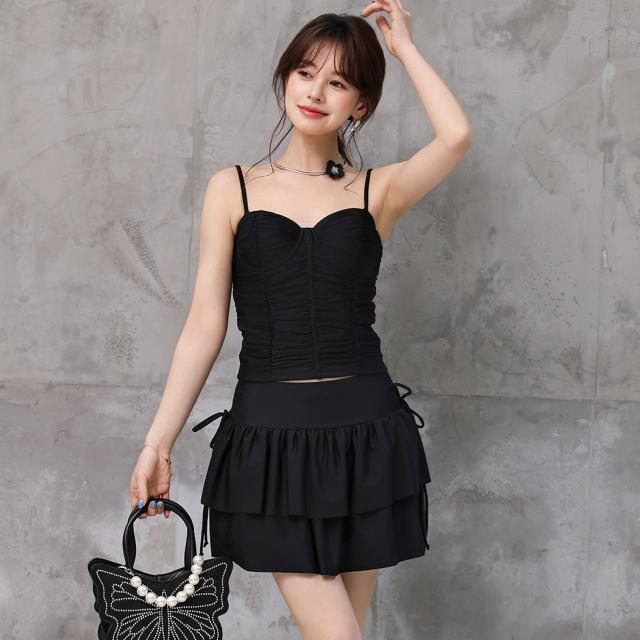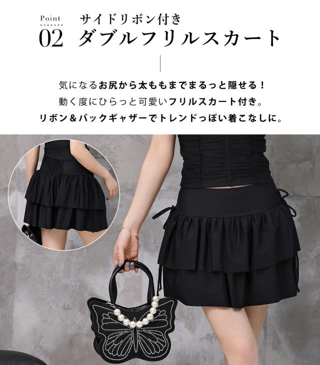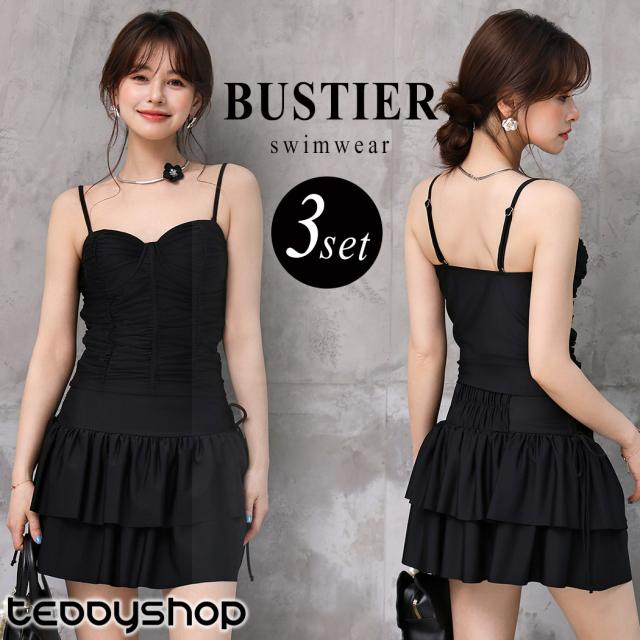 夏新作 水着 ビスチェビキニ レディース 体型カバー 3点セット セパレート クロップド丈 ブラ ショーツ スカート ティアードフリル ダブル ワイヤー入り パッド付き バスト 盛れる ウエスト ヒップ お尻 太もも カバーアップ 肩紐調節 取り外し可能