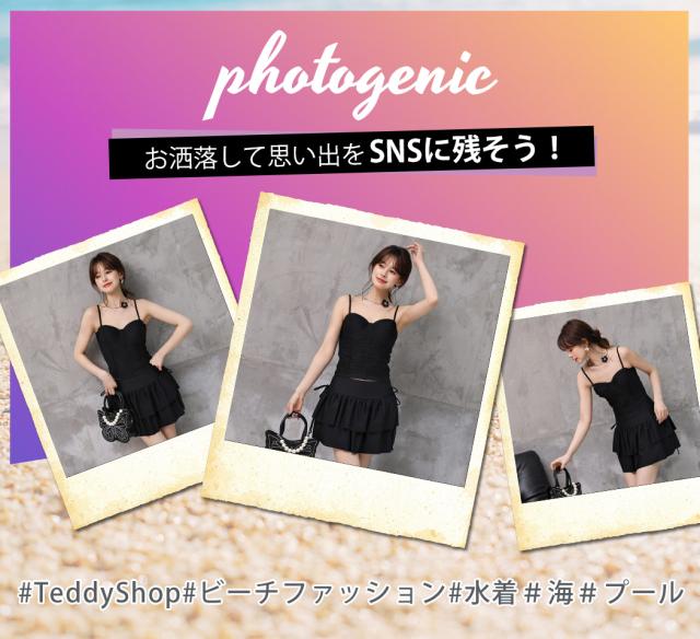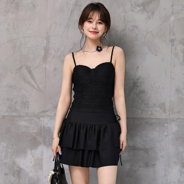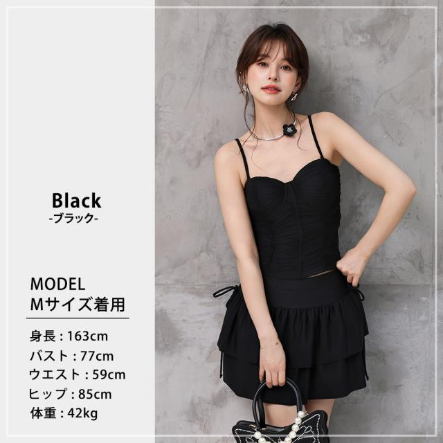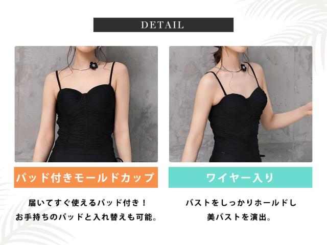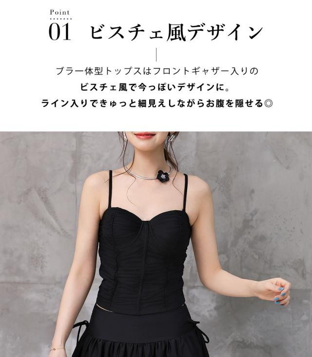 ブラ一体型トップスはフロントギャザー入りのビスチェ風で今っぽいデザインに