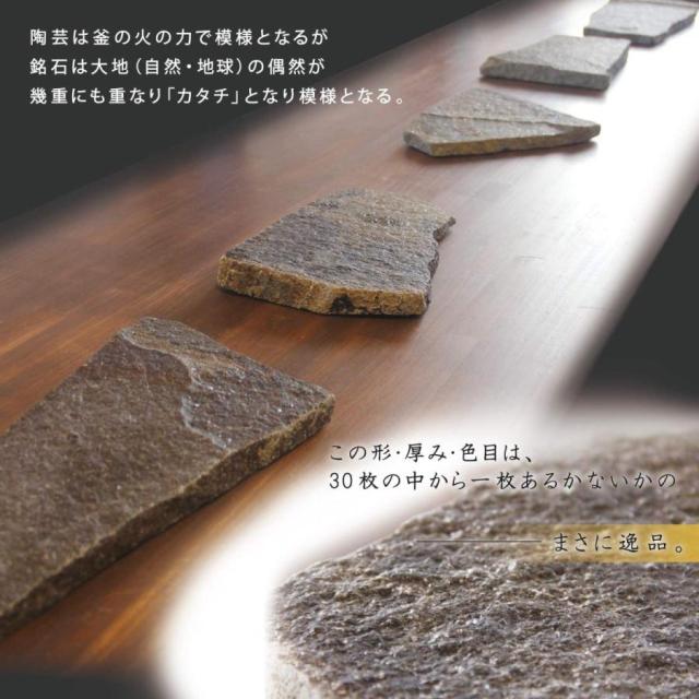 世界でも諏訪地方でしか算出できない銘石で、 その独特で素朴な侘び寂びの風合いは他の石はもちろん、陶器のお皿では到底表現できません。
