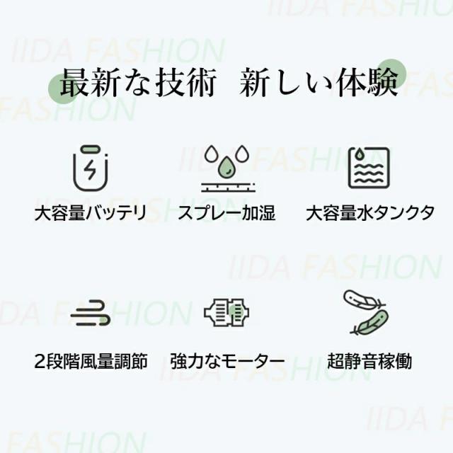 スプレーミスト加湿機能:水タンクから発生する微細なミストが室内の湿度を保ち、快適な涼しさを提供します。乾燥した季節や空気も心地よく感じられます。
